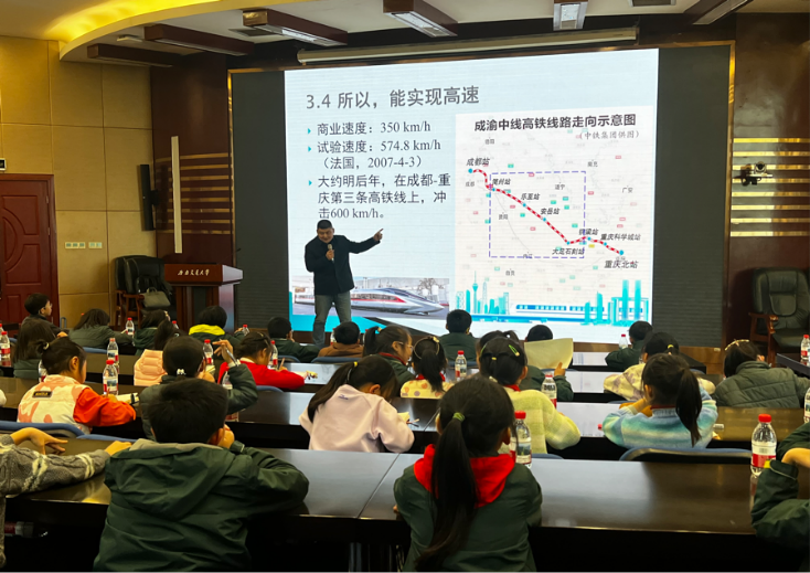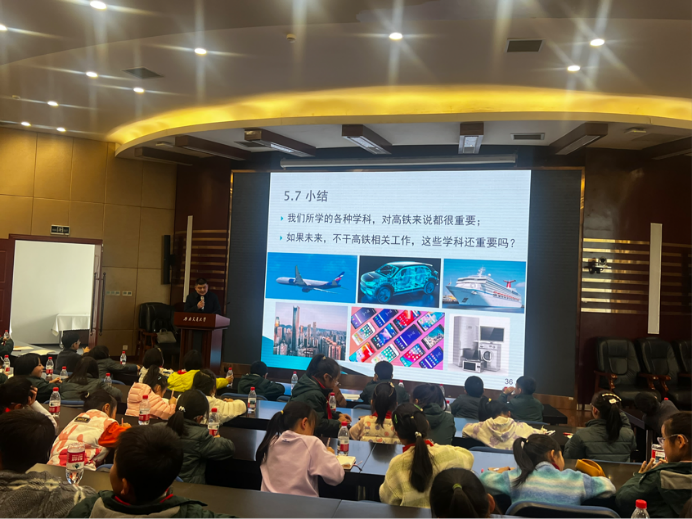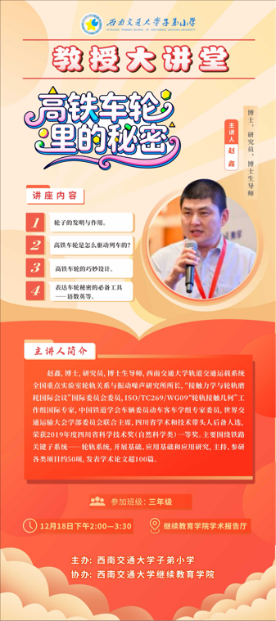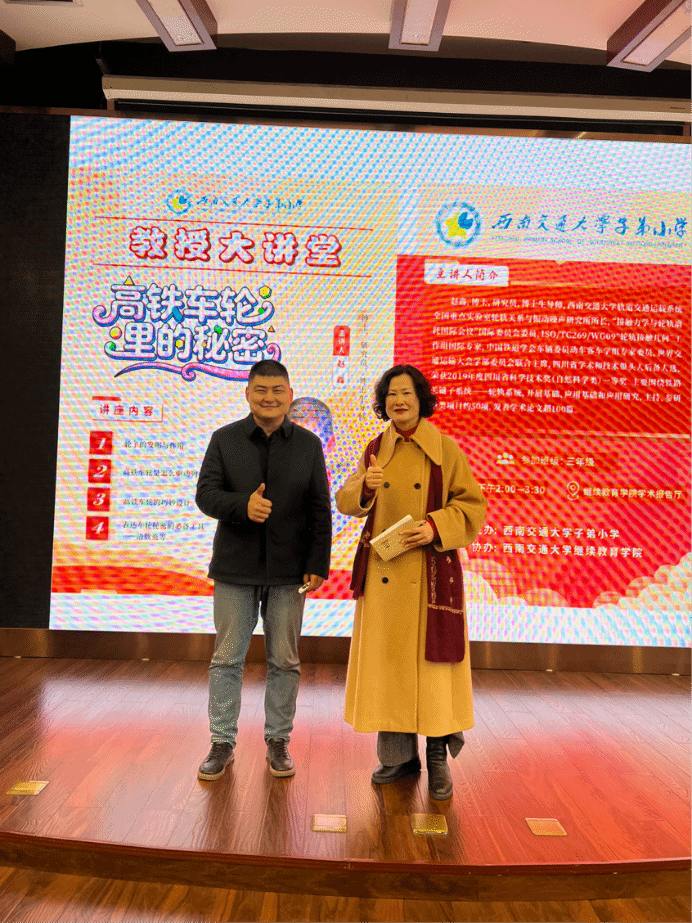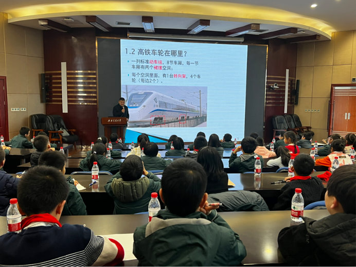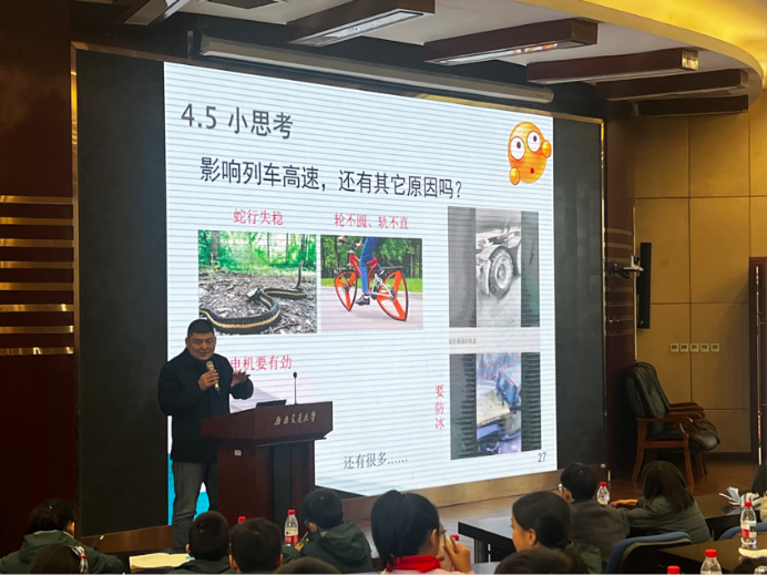 2025年12月18日下午,西南交通大学子弟小学“教授大讲堂”第八期在继续教育学院学术报告厅如期开讲。轨道交通运载系统全国重点实验室的赵鑫研究员受邀主讲,以《高铁车轮里的秘密》为主题,为三年级学子带来一堂兼具趣味与深度的趣味科普课。