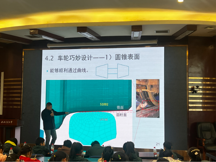 赵鑫研究员入拆解高铁车轮的精妙设计:圆锥踏面如何助力列车平稳过弯,轮缘如何保障行驶安全;并以自行车在坑洼路面颠簸的体验为参照,引导学生思考“轮不圆、轨不直”对列车运行的影响。他还抛出“蛇行失稳”“动力匹配”“防冰技术”等专业议题,启发孩子们从多维度理解高铁设计的科学性与精密性。