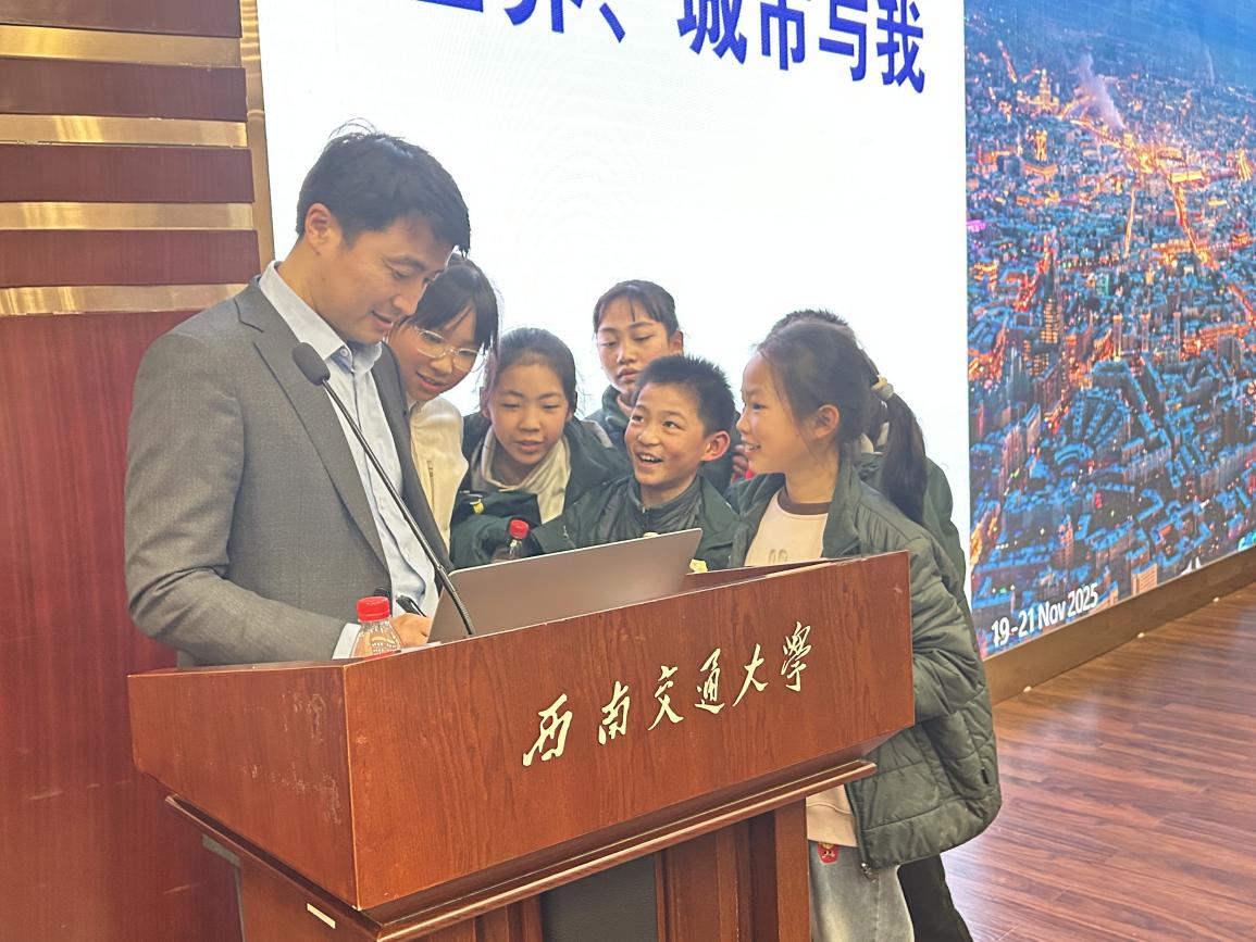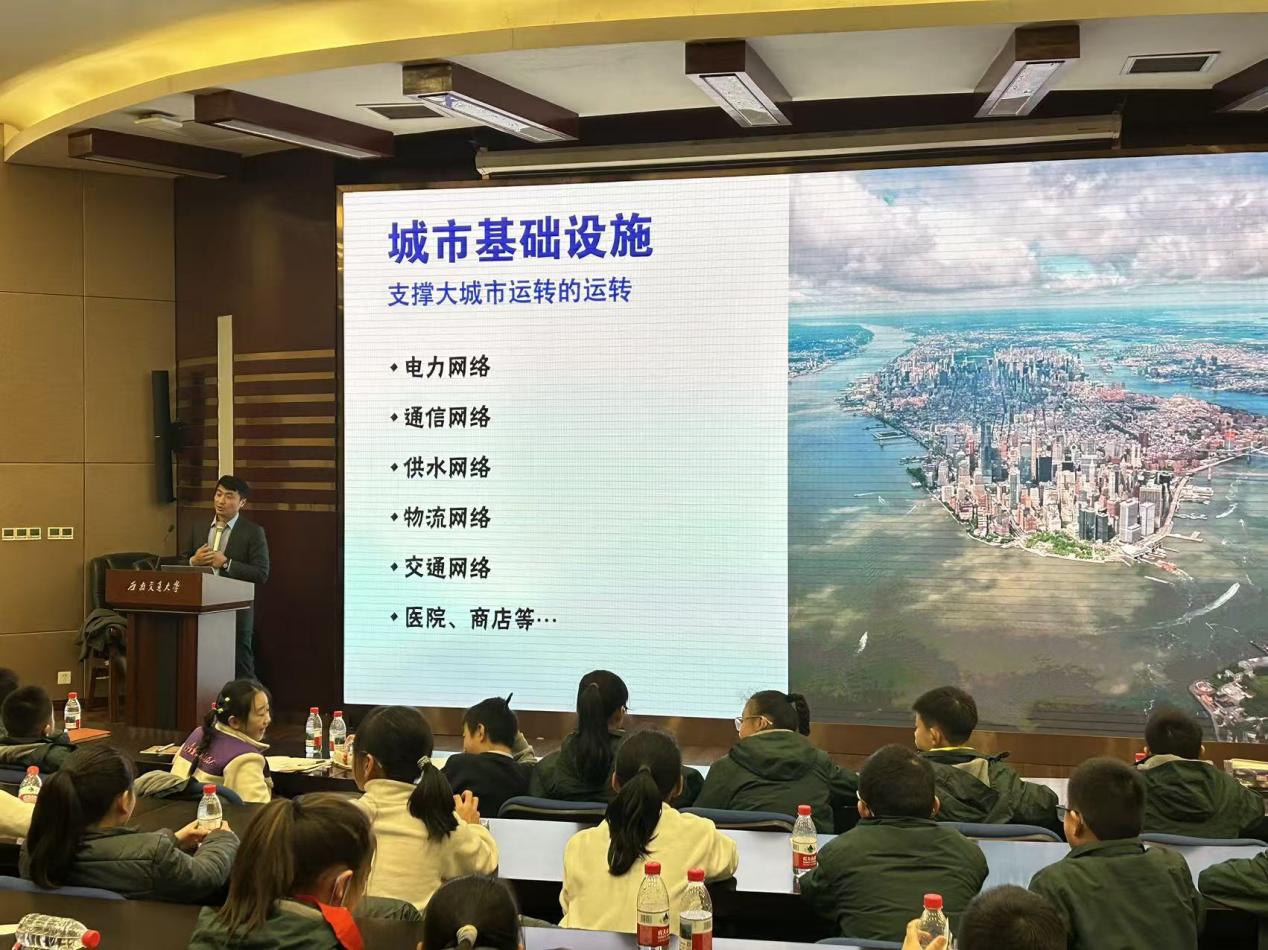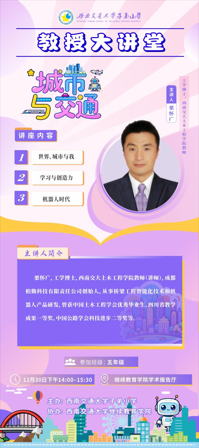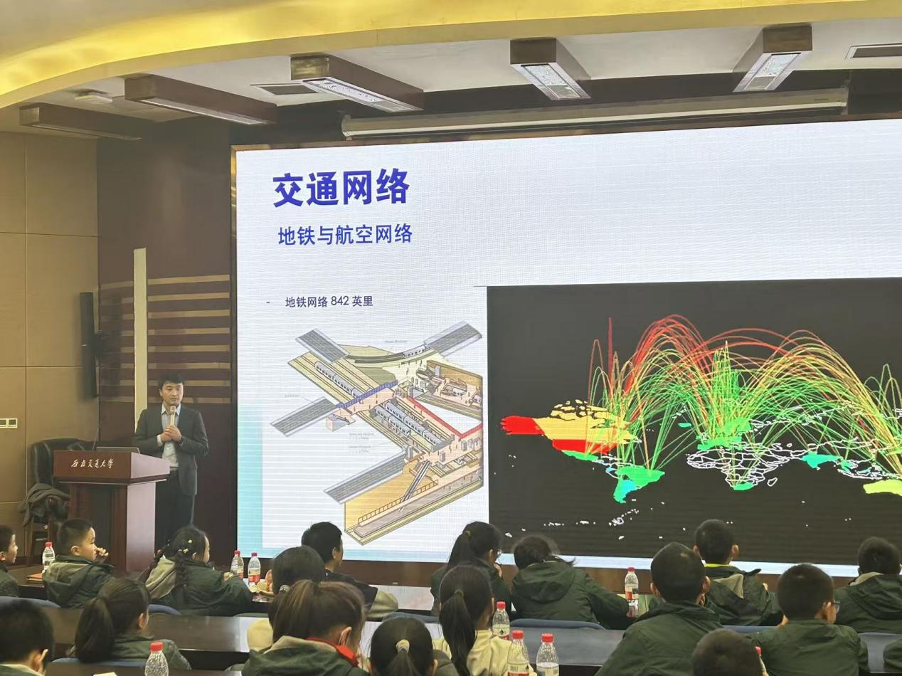 2025年12月30日,西南交通大学土木工程学院栗怀广老师走进我校“教授大讲堂”,为五年级学生带来了一场题为“城市与交通”的生动讲座。讲座分为“世界城市与我”和“机器人时代”两大部分,通过图片展示、故事分享和互动问答,带领孩子们走进城市与交通的精彩世界。