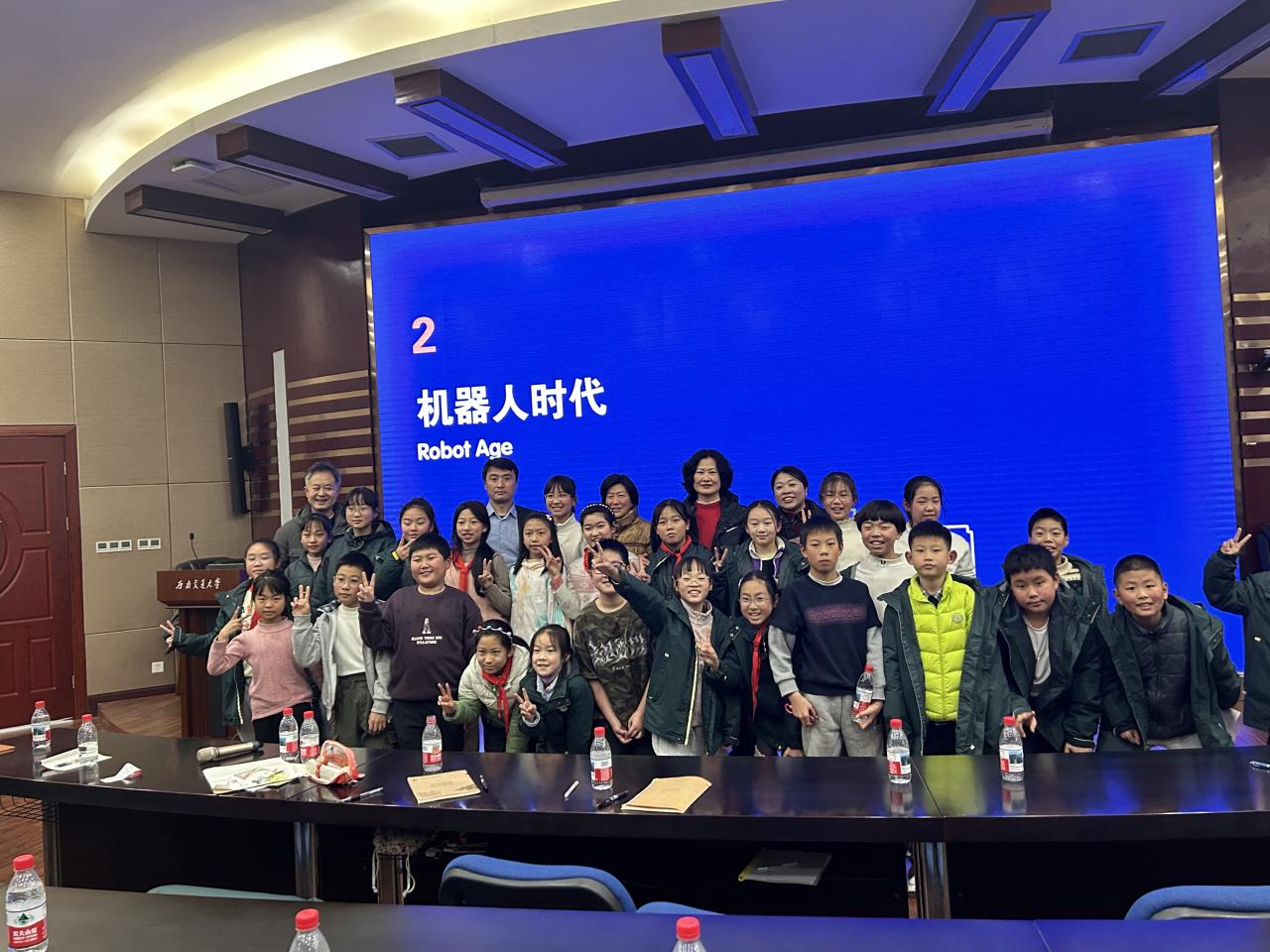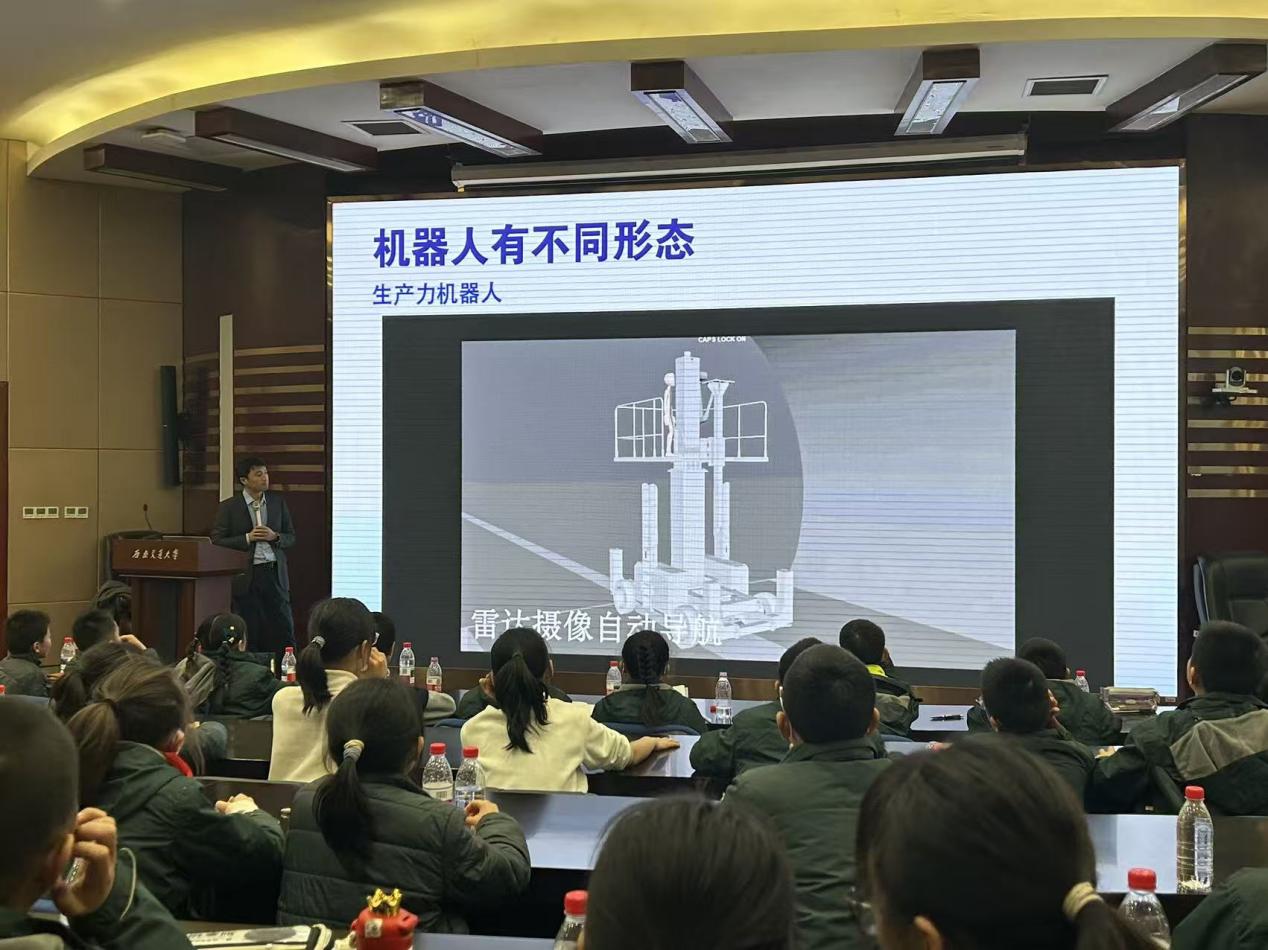 进入“机器人时代”部分,现场气氛更加活跃。栗老师以连续提问的方式引导孩子们思考:“机器人有哪些形态?”“它们能帮我们做什么?”“机器人哪里不如你?”学生们脑洞大开:人形机器人、配送机器人、扫地机器人;可以搬东西、讲故事、辅导作业;但它们不会吃饭、没有感情、需要人指令…… 栗老师简要介绍它们在建筑、交通、日常服务中的应用,并总结到:机器人是工具,人才是城市的主人。未来城市需要你们去设计,去赋予科技温度。