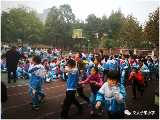 随着一阵尖锐而又急促的火警警报声响起,各班在班主任或科任老师指挥下,紧急进入警备状态。孩子们迅速排好队,从教室往楼梯口撤退。他们紧贴着墙壁或楼梯栏杆,右手捂住口鼻,弯腰、有序、安全地向前小跑。此时,四个一楼楼梯口烟雾弹燃放滚滚呛人的农烟,全校师生毫不慌乱,安排人员各自尽职守护岗位,在2分钟之内按预定的疏散路线全体师生安全撤离到指定地点——校园的篮球场。